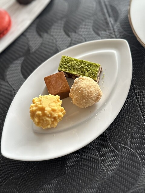 今回もアラカルトでのチョイスとなりました。コース料理で行きたいところですが、あいにく胃袋がそれを許さない状況。食べ歩きマニアとしては苦渋の決断が続きます。更に悔しいことにデザートも断念w しかし料理はなかなか素晴らしいものでした。アミューズの作り込みはとても精巧ですね。ホタテのカルパッチョのソースはライム・グレープフルーツ・ジンジャービールと甘酸っぱさと爽やかな香りが非常に心地よいです。そして今回最も美味しかったのが手長海老。キノコとビスクの濃厚ソースが最高に美味しい。もちろん手鍋追いソースも付いてきて、パンと一緒にバクバクたべてしまう素晴らしいソースがたまりません♪ メインの灰色山うずらは珍しい食材ですね~。恐らく初体験であると思われます。肉質はどうでしょう、うずらに似ていますね。鳩や鴨ほど滑らかな肉質ではないですが、野性味のある味わい。もう一つのメインであるフォアグラと数種類のキノコ煮込みがこれまた素晴らしかったです。フォアグラのパテがどうしてこんなに滑らかなのか?と思うほど丁寧に作られています。それを味わい深い秋のキノコ煮込みに乗せちゃうんですから、美味しくならない訳がないのです。様々なハーブの香りがわき役として光っていますね。デザート行きたいところですが、もう腹パン過ぎて断念!!しかしコーヒーは飲みたい。これまでどこのレストランも小菓子が充実してまして、こちらも素晴らしい。6種類の小菓子を食べた後に追いうちの様に10種類のチョコレートが!!ん~、全部食べたいけどさすがに無理。でも頑張って4種類は食べました。やっぱり美味いっすね~。今日頂いたものは全て美味しかった。多分ウェイターさんのおかげで美味しい料理をうまくチョイスできたのだと思います。ここのお店に来て大正解だったと感じました。