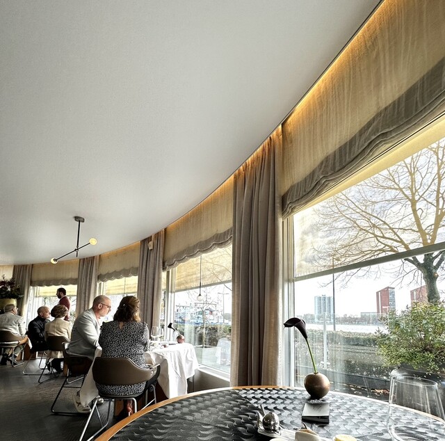 目の前の100円パーキングに車を停めて、入店するとガラス張りの外にはゆったり流れる「ニューウェ・マース川」と、行き交う船が一望できる席に案内されました。
