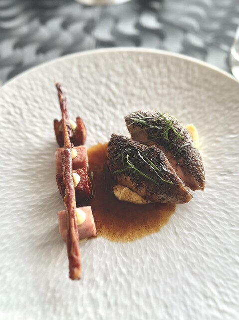 ⑤灰色山うずら、パンチェッタと豚バラ、イェネーファソース、ザワークラウト、マッシュポテト、