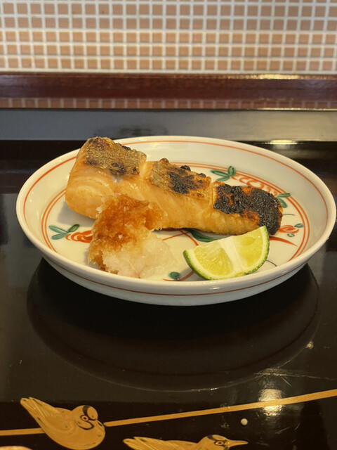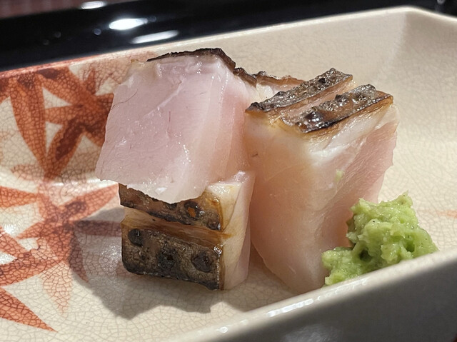 雉羽太漬け煎り酒塗り炙り、菊のおひたし