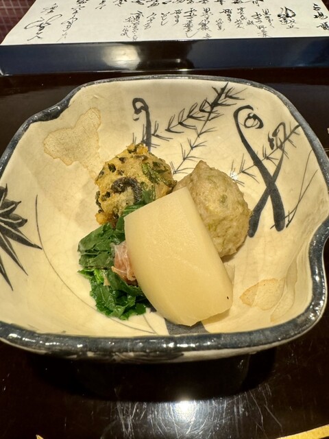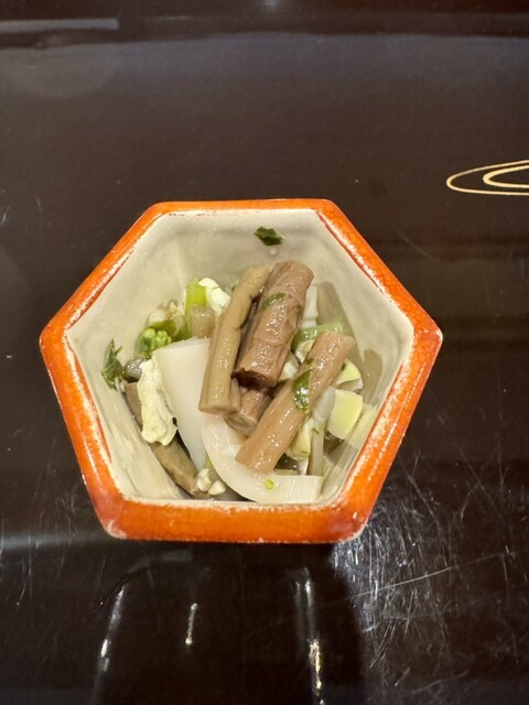 ゼンマイの揚げたもの、ふきのガンモ、葉物にカブ。優しい味わいで美味い。山菜の調理がやはり絶妙。
