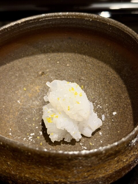 煮凝りは魚魚魚魚魚!!のどーーーん味。ナンテコッタ。ゼラチンを使用しない煮凝り。複数の魚をこのサイズにギューーーッと凝縮している。いしもちの塩揉みはとんでもないもちもち食感。味わいが深過ぎます。