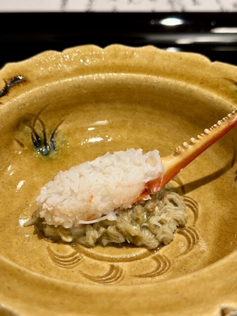 香ばしく焼いたカニ爪を、蟹味噌+蟹身の“旨味の沼”にダイブ。身は半レアでトロッと甘い。下の蟹味噌も濃厚で完璧。