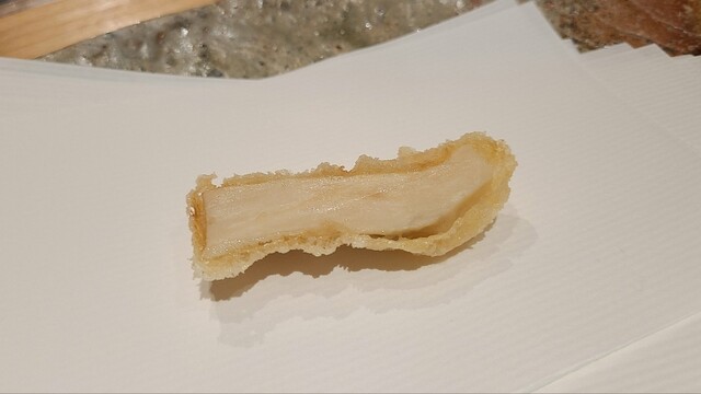 ⑩蓮根(茨城県産、野口農園) やや時間を掛けて揚げてしっかり火入、澱粉を活性化させ、一層の甘みを引き出しています 蓮根の澱粉が油に溢れ、焦げてから衣に付着、ファーストタッチから甘みを感じます