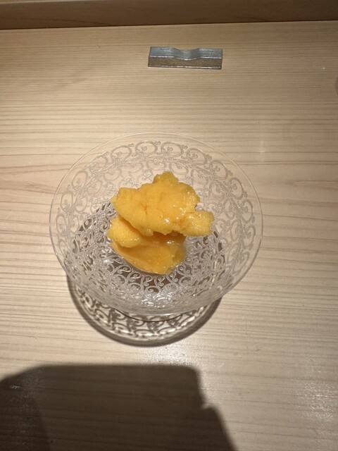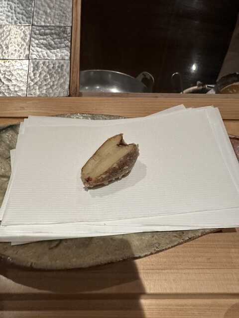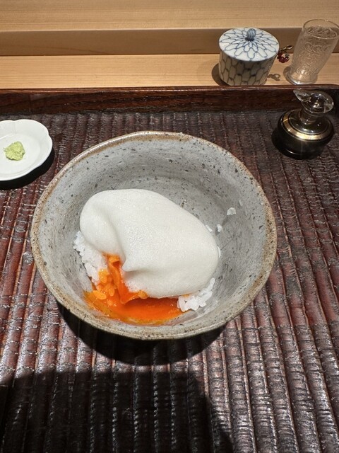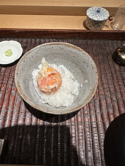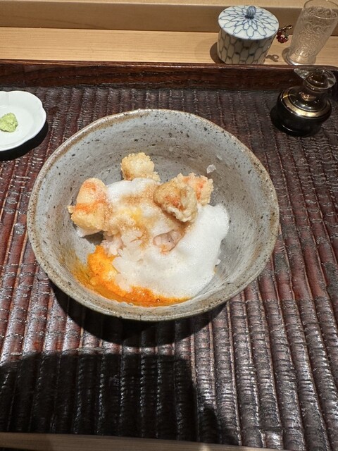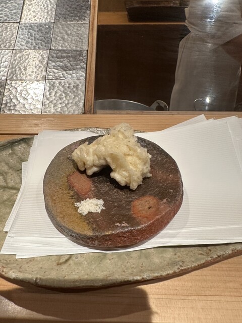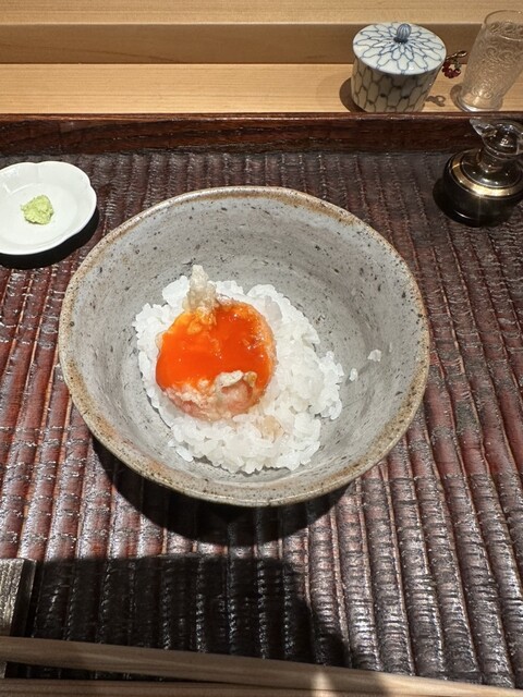 黄身の天ぷらは、衣をつけて揚げたもの。「冷凍してこのとろみを出しているのか?」と伺ったところ、火入れの技術でこのとろみを出していました。