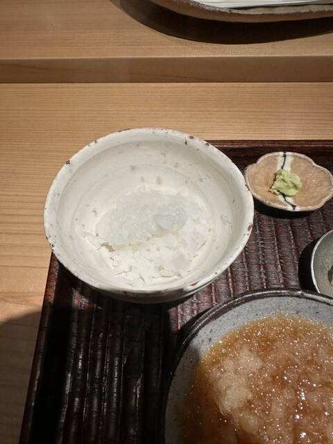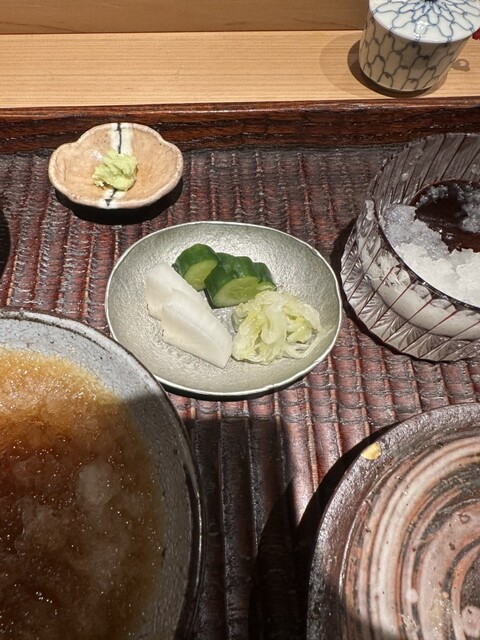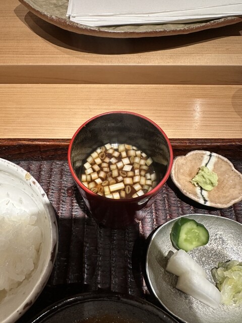 ご飯、黄韮の赤だし、お漬物付き。一つは出汁と大根おろしで。もう一方は山葵と塩で美味しく頂きました。