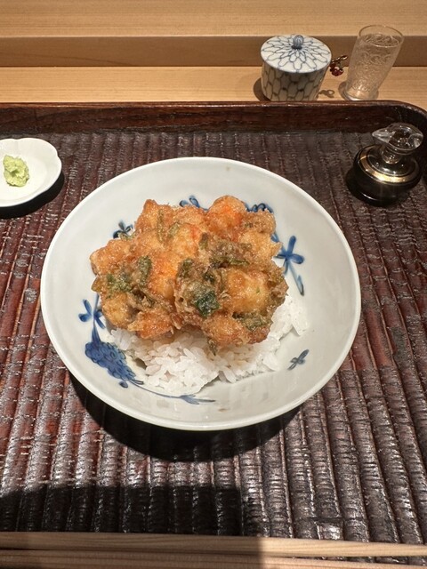 車海老と小柱のかき揚げに、たっぷりとかかったタレが絶妙で非常に美味しいです。