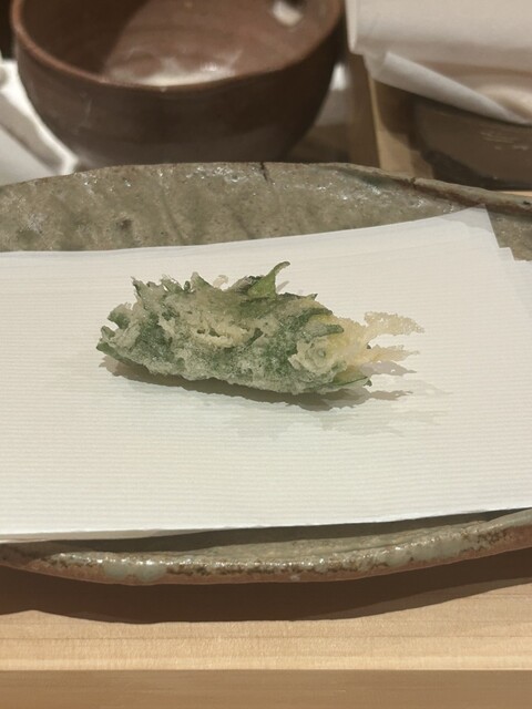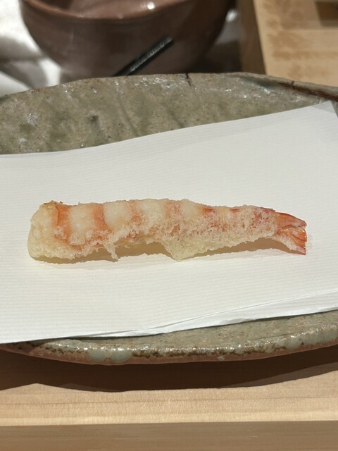 天ぷらは車海老からスタート、2尾で1尾は半レアでいただきますがどちらもとても甘く、ここから野菜・魚介・野菜・魚介~の流れが続いていきます