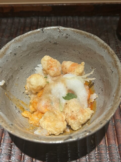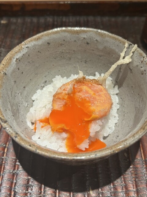 卵かけご飯(卵黄天ぷら、メレンゲ、海老天)