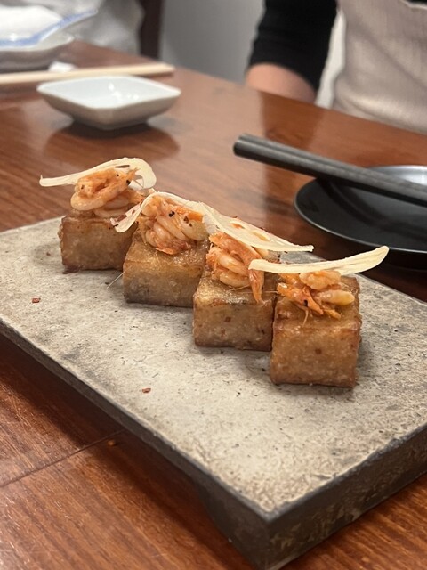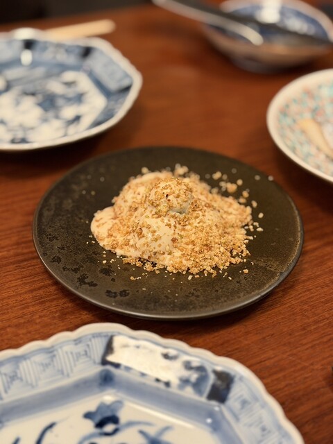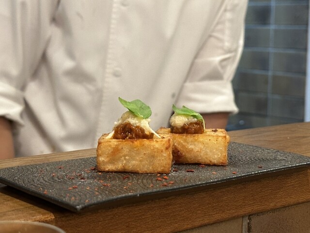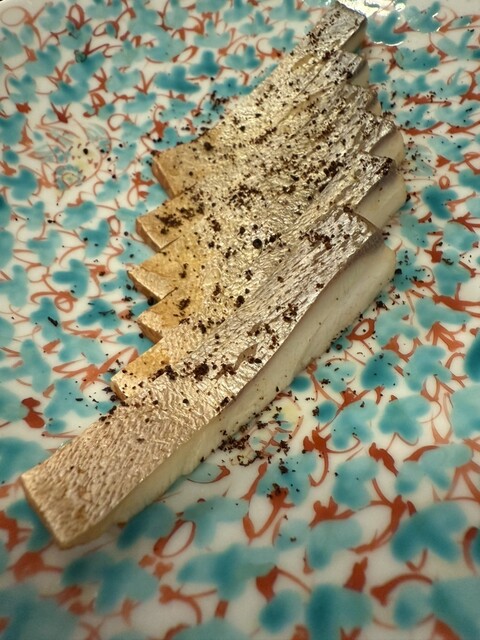 ●シャインマスカット豆腐ようと胡麻のソース 飴をかけてナッツ砕いたのがふってあります