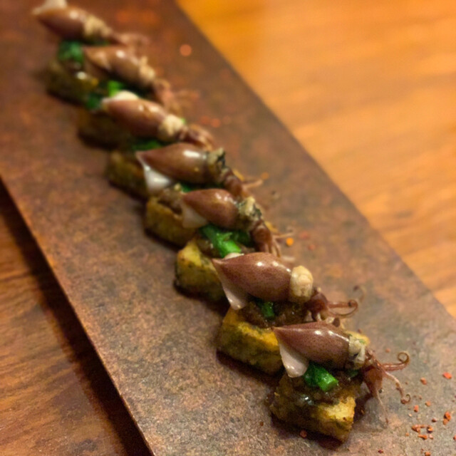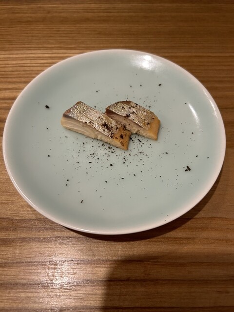 ◆前菜:シマアジの燻製、徳島の原木しいたけスパイシースナック掛け、...