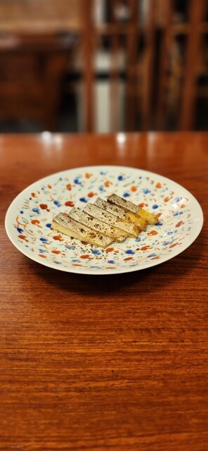 ●シャインマスカット豆腐ようと胡麻のソース 飴をかけてナッツ砕いたのがふってあります