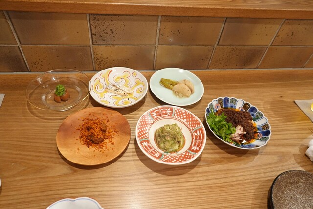 前菜6種(ローストよだれ鶏、ピータン玉子焼き、蛸の山椒和え、海老芋、クラゲ、シマアジ)