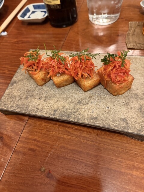 ●シャインマスカット豆腐ようと胡麻のソース 飴をかけてナッツ砕いたのがふってあります