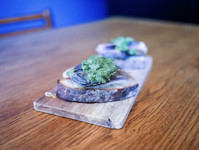 ☆炙り鯖のブルスケッタ 肉厚の鯖とバジルソースが美味しいです。