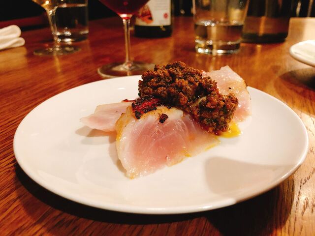ナチュールのイタリアワインをペアリング。これも至福。この店には下戸は来ないでほしいとのこと。ただしワンオペなので、グラスは白か赤かくらいしか交換しないので、繊細にワインを楽しむ人には不向きかも?