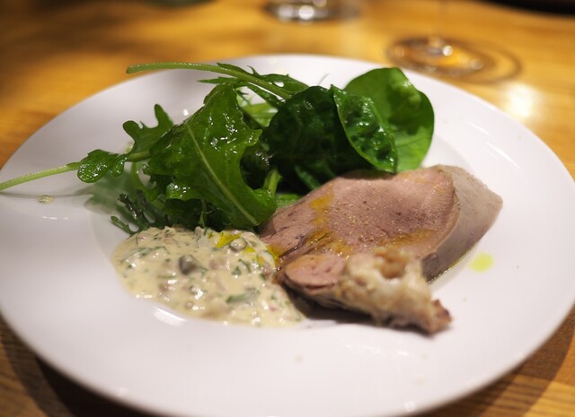 低温ボイルして厚く切った牛タン。酸味が効いたタルタル風味のつなとアンチョビ入りソース。