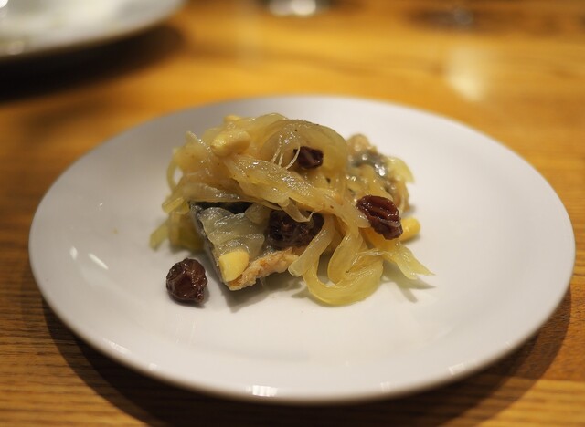 あつーく切った脂身たっぷりのしめ鯖のブレスケッタ。イタリアンパセリのソースで。