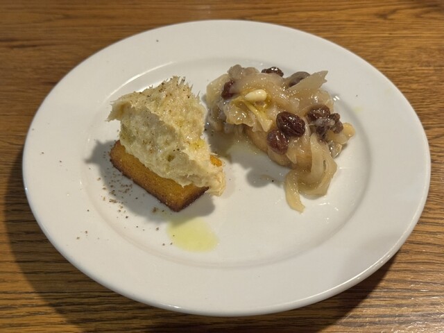 鰯とポレンタに塩鱈2週間熟成をのせた1品、