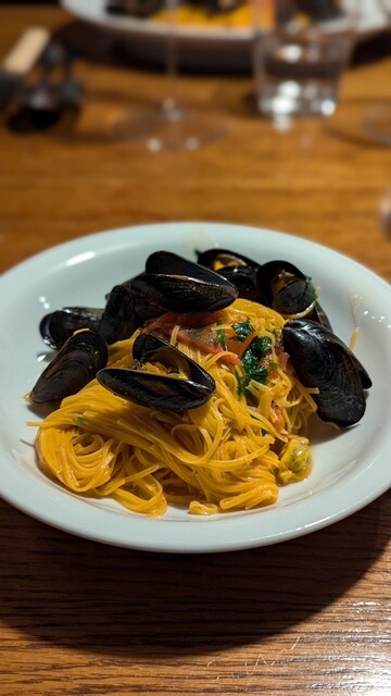 〆のタヤリンは塩不使用でムール貝から出る塩みのみで絶妙な味の仕上がりに。