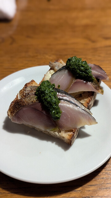 パンの上にチーズのコク、鯖の旨み、サルサヴェルデの酸味が素晴らしい一体感。見た目の美しさも美味しさも最高。