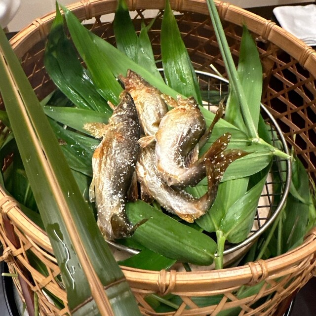○卵と身の味わいが最高な子持ち鮎の山椒風味の炭火焼き、そしてバリバリと頂くことが楽しい鮎の頭と骨の煎餅、、
