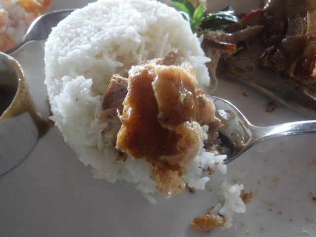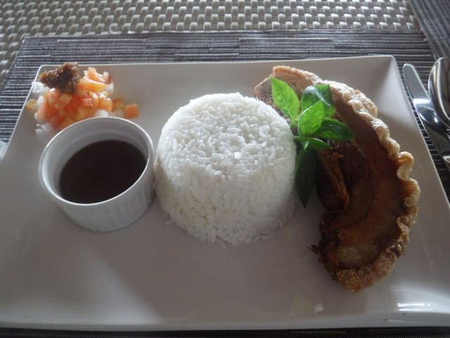 レチョン・カワリ—。豚肉をカリカリに揚げて、特製のグレイビーソースで食べる物。
