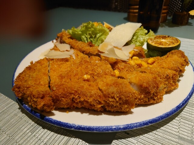 ツレと協議の結果、「豚肉のカツレツ ミラノ風ポークチョップをコーン、ロケットチェリートマト、パルメザンと」「マルゲリータ」「海のサラダ シーフードサラダ、インゲン、じゃがいも、パセリ」で。足りなかったら追加しよう。