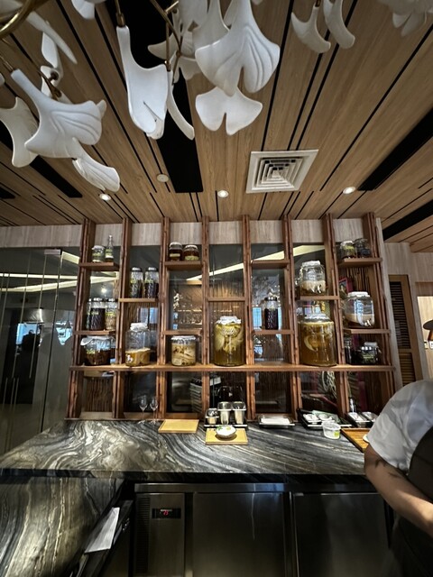 入店するなりテーブル席に着く前に「①ドラゴンフルーツのコンブチャ」と「②ランバル(フィリピンのリキュール)で漬けた皮むきブドウ」でお出迎え。