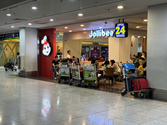 フィリピンを代表するハンバーガーのチェーン店.フライドチキンなど他の料理もあります.空港の1階にある店で,家族客も含めて賑わっています.特に賑わっているのがオーダーの列.日本のマクドナルドなどのつもりで並びましたが,とにかく列が進みません.一人当たり3〜5分ほどかかっているようで,10名弱の列で順番が来るまで結局30分かかりました.オーダーすると,明らかに作り置き(といってもそれほど時間は経っていない)のバーガーにポテトなどをトレイに載せて渡されます.大口の注文は別窓口から提供されていました.オーダー列のスピードが遅いおかげか,店内にはわずかながら空席がありました.