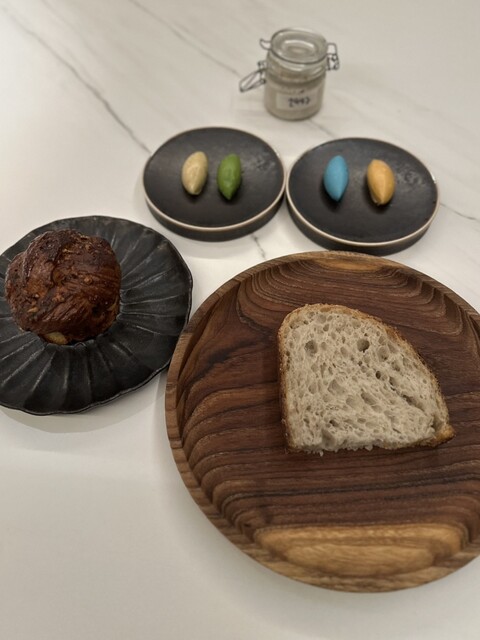 ⑨4種のバター(オレンジ色:ドライトマト 青色:バタフライピー 緑色:パセリとラード ベージュ色:ブラウンバター)と2種の自家製パン
