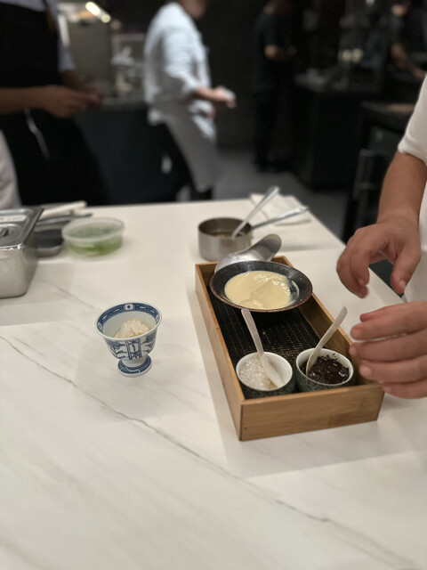 ④ストリートフードの「タホ」(温かい豆腐に黒糖のシロップをかけて、サゴをトッピングしたフィリピンの屋台グルメ)をイメージした出汁スープロワイヤル タピオカとXО醤