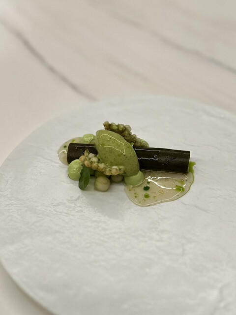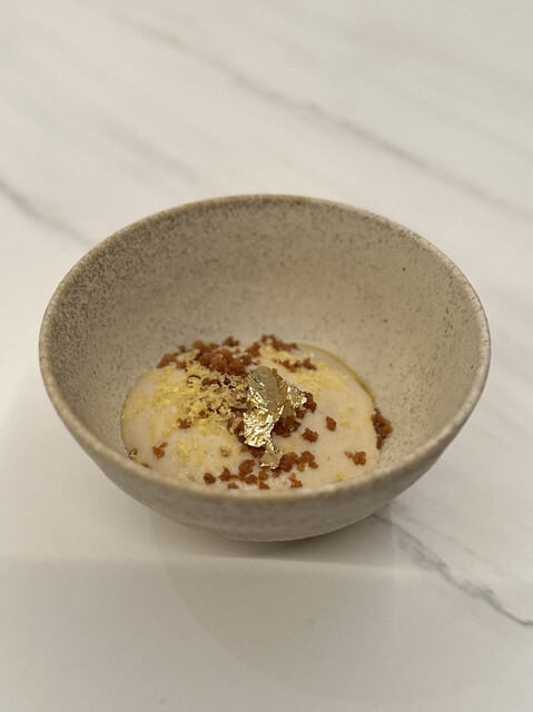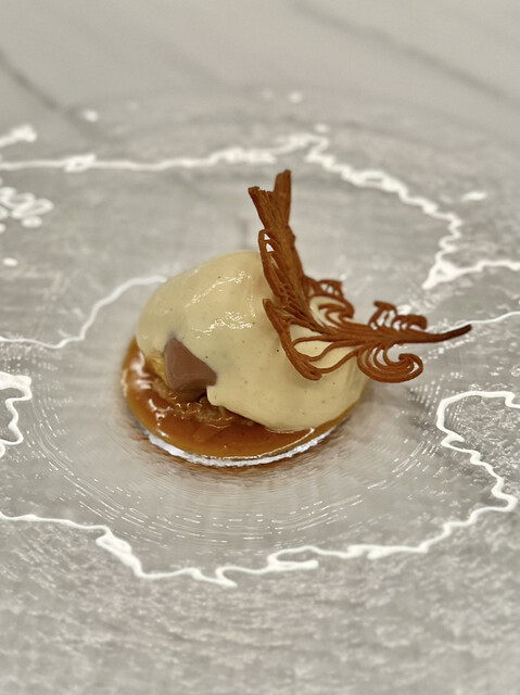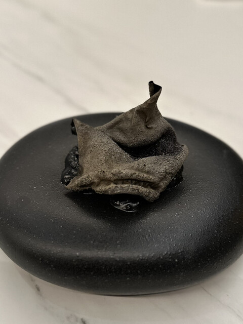 ①レンコンスライスに見立てた半固形の卵黄にイカ墨の衣を纏わせ、大豆クリームを乗せたもの