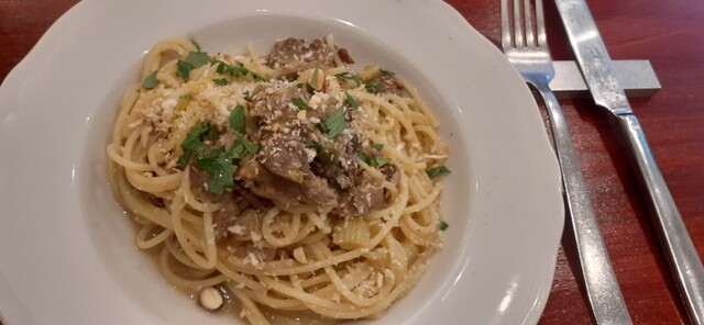 カルパッチョは鯛は身がしまっていて良い食感、シャインマスカットが散らしてありオリーブオイルの風味がとても良い。マグロの頬肉のラグーパスタはおさらいまで熱々の提供です