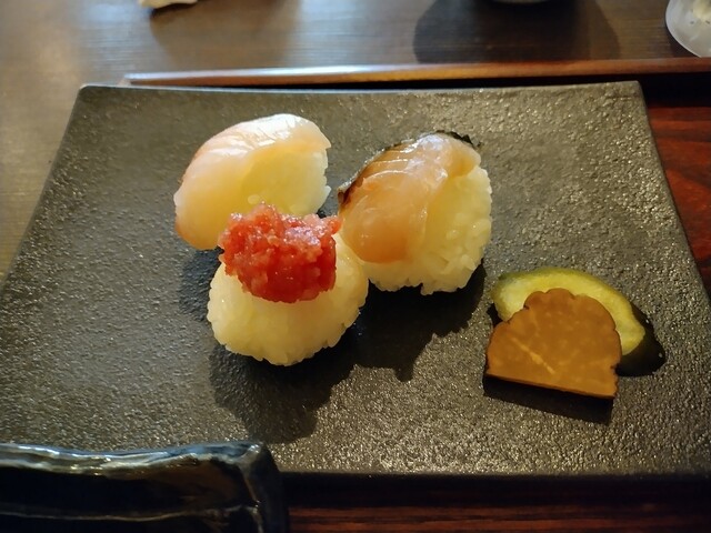 ランチはタコとおくらの天ぷらトッピング稲庭うどんにてまり寿司付きでこれまたお酒の後にぴったりでした。