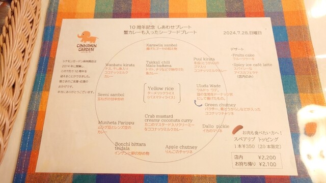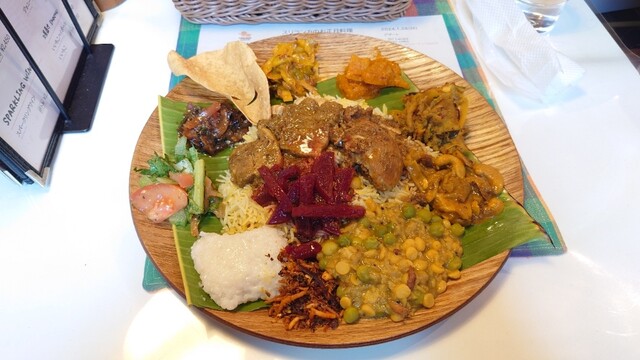 当日は月末のスペシャルプレートの日ということでした。初めてスリランカ料理を頂きましたがスパイスが利いてとても美味しかった。プレートとは言っても色々な料理が沢山盛り付けられ、ボリュームもあり大満足。食後のケーキとホットティーまでついてました。