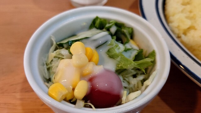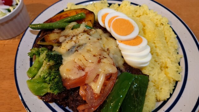 かれーにはピーマン、トマト、ブロッコリー、いんげん、かぼちゃ、ナス、じゃがいも、にんじん、ゆで卵、豚バラブロックもたっぷり入ってました。とにかく野菜たっぷりで大満足。