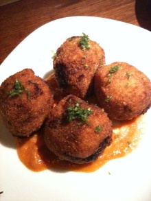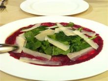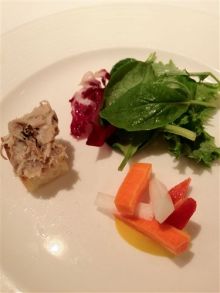 ほんと、鹿がやわらかくって、くさみはおさえてあってとても上品な味わい深い鹿肉をいただいたかんじですね。カシスソースがまたあうし。 下の、マッシュされたものと、上のかりっとあげられたものは、なんと根セロリですよ! ちょっとセロリの青臭いかんじをとりいれて、鹿くささをけしてるのかしら?一緒にいただいてもベストなハーモニーをうみだします!