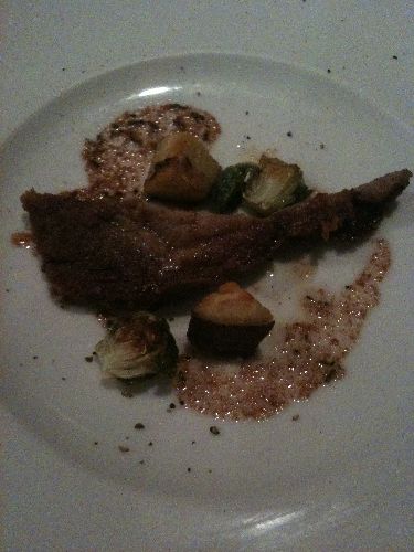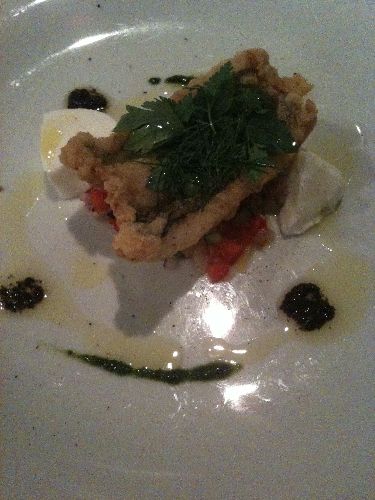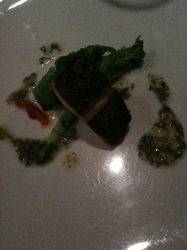 これは、面白いしおいしい。モッツアレラのムースとトマトをつけて食べる魚は本当に、おいしい!香ばしい魚にまろやかなムース状のチーズ、そして濃厚なトマト。あ~~、これは、ここではないと食べられないとおもわれる一皿でした。 感動!