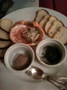 クロオリーブ、かに味噌、バスク豚のリエットの3種類のパテを