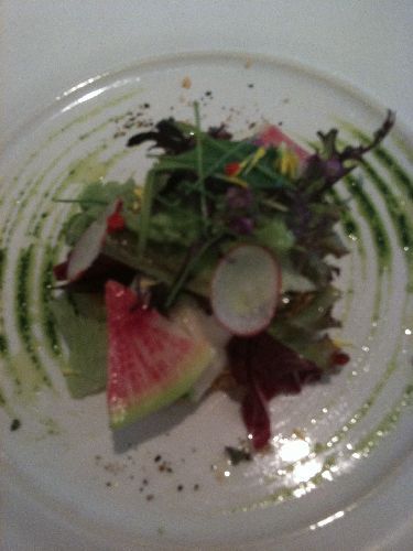 (ぜんぜんちがうけど、用は、イカ飯みたいに、イカのなかにつめてあるのね。。たとえがわるくてsorry) 味は秀逸。色とりどりの野菜&ほんのちょっと食用花がはいってて、だからかとっても彩りが素敵でした。