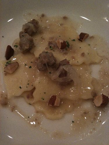 パスタです。ちょっとハーブのきいたサルシッチャのようなお肉と、ざっくりくだかれたアーモンド。。 歯ごたえとすべての味のバランスもいいし、これはぐれいと。もうすこし食べたいよ~。