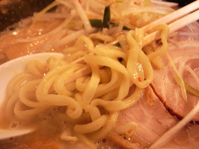 【麺】 断面がほぼ四角い太麺で、適度なもちもちとした食感で歯ごたえすすりやすさともに良好