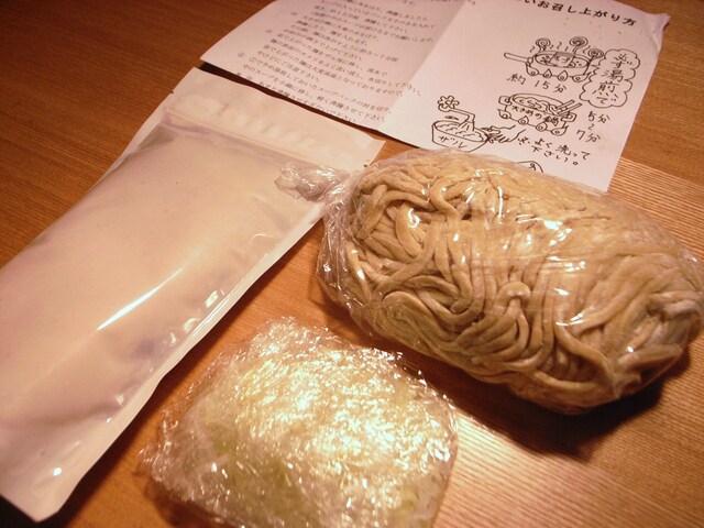 臨時休業だそうで代わりにお土産用のつけそばを一食500円で提供してくれた。