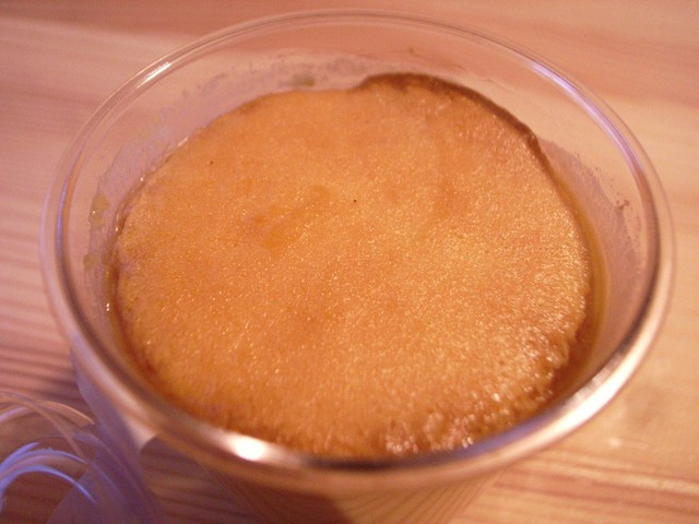 上部がスフレ状になっていて、その下がやわらかいトロトロのプリン、そして底にはカラメルソース。