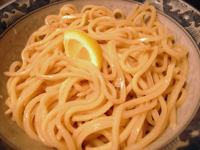 【麺】 平うちの太縮れ麺、大盛り無料サービス