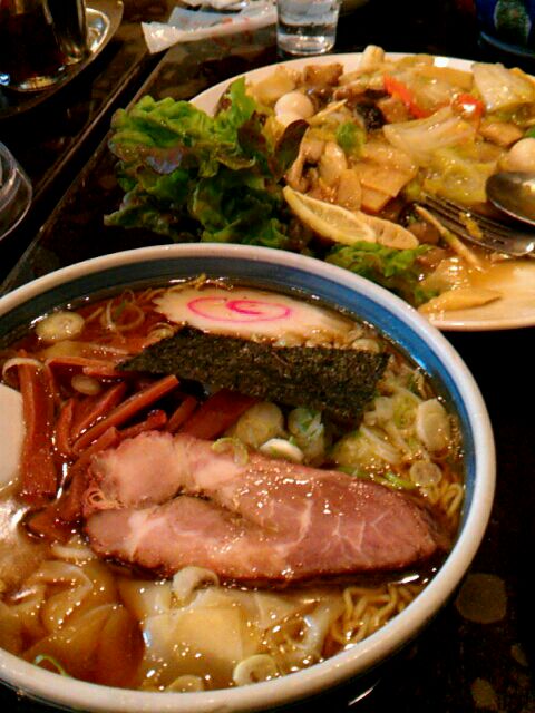 課長が支那そば、僕がワンタン麺、そして餃子と八宝菜をシェアした。