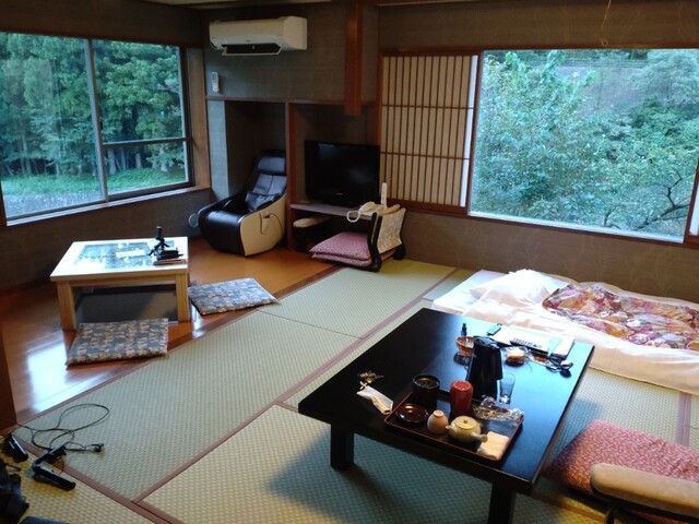 2つある窓はかなり大きめでそこから山や川の風景が望めます♪そして専用のマッサージチェア付き