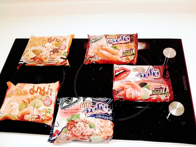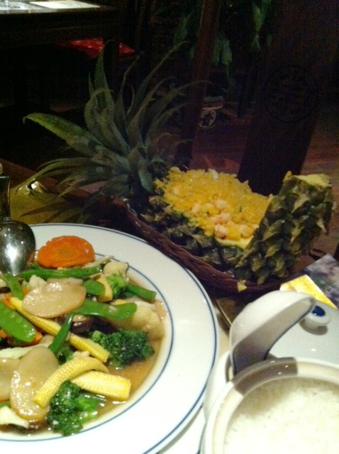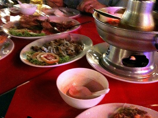 トムヤンクン、イカの炒め物、スズキの揚げ物