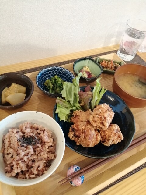 無農薬野菜をふんだんにつかったおばんさいがカラダにやさしい。有機コーヒーを注文して、砂糖とミルクをお願いすると砂糖のかわりにハチミツ、ミルクのかわりに豆乳が登場。唐揚げ定食を注文し、キレイにペロリと食べてしまうとスタッフさんが「キレイに食べてくださってありがとうございます」って、褒めてくださる。居心地満点です。